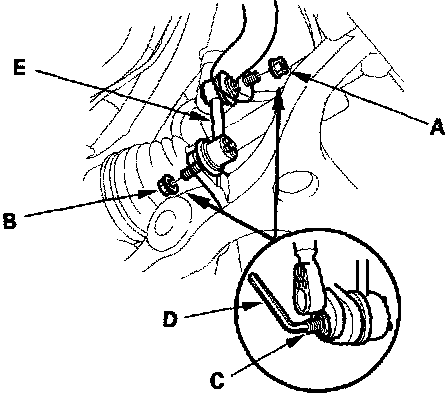 2. Remove the self-locking nut (A) and flange nut (B) while holding the respective joint pin (C) with a hex wrench (D), and remove the stabilizer link (E).