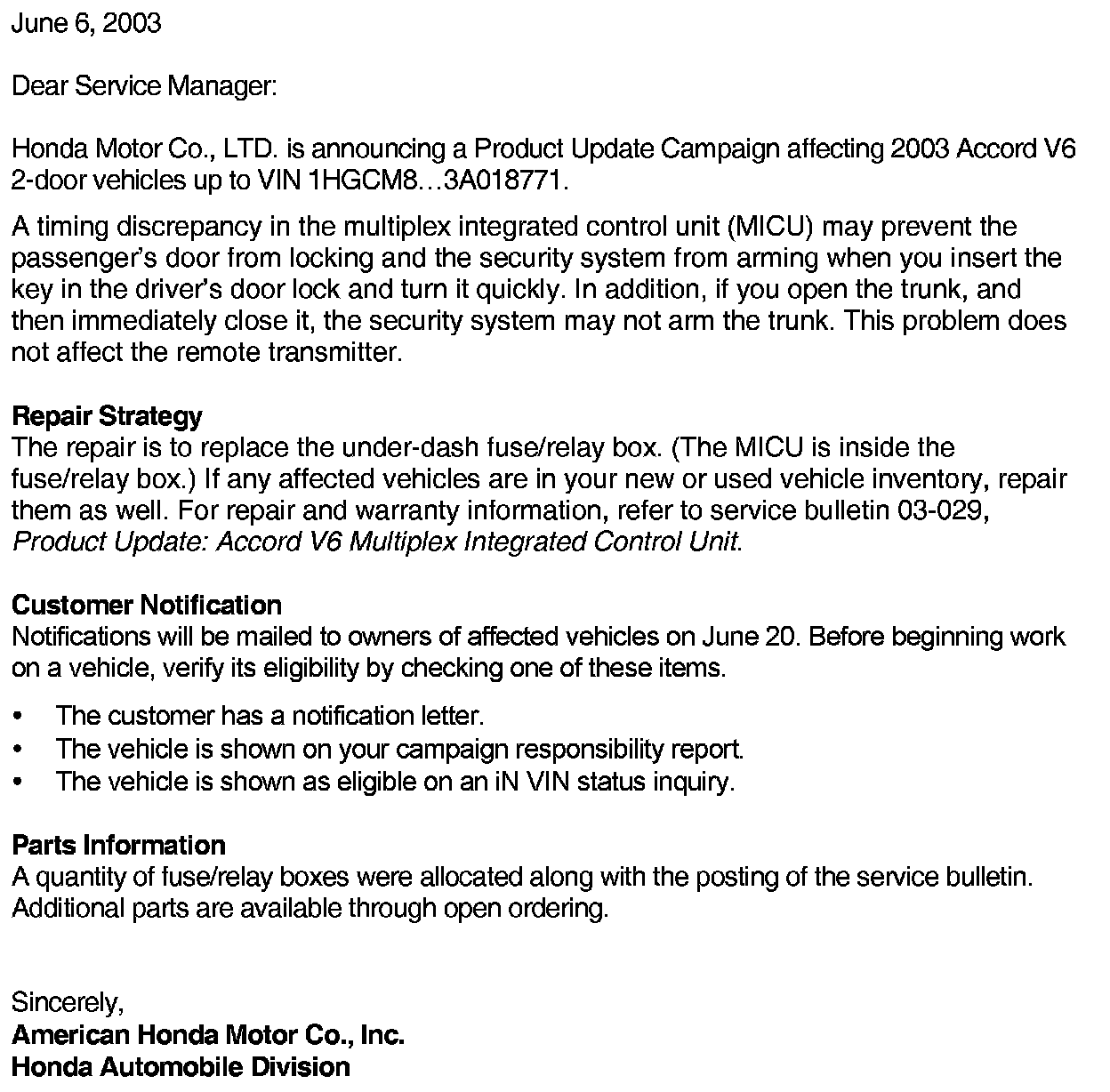 Service Manager Letter