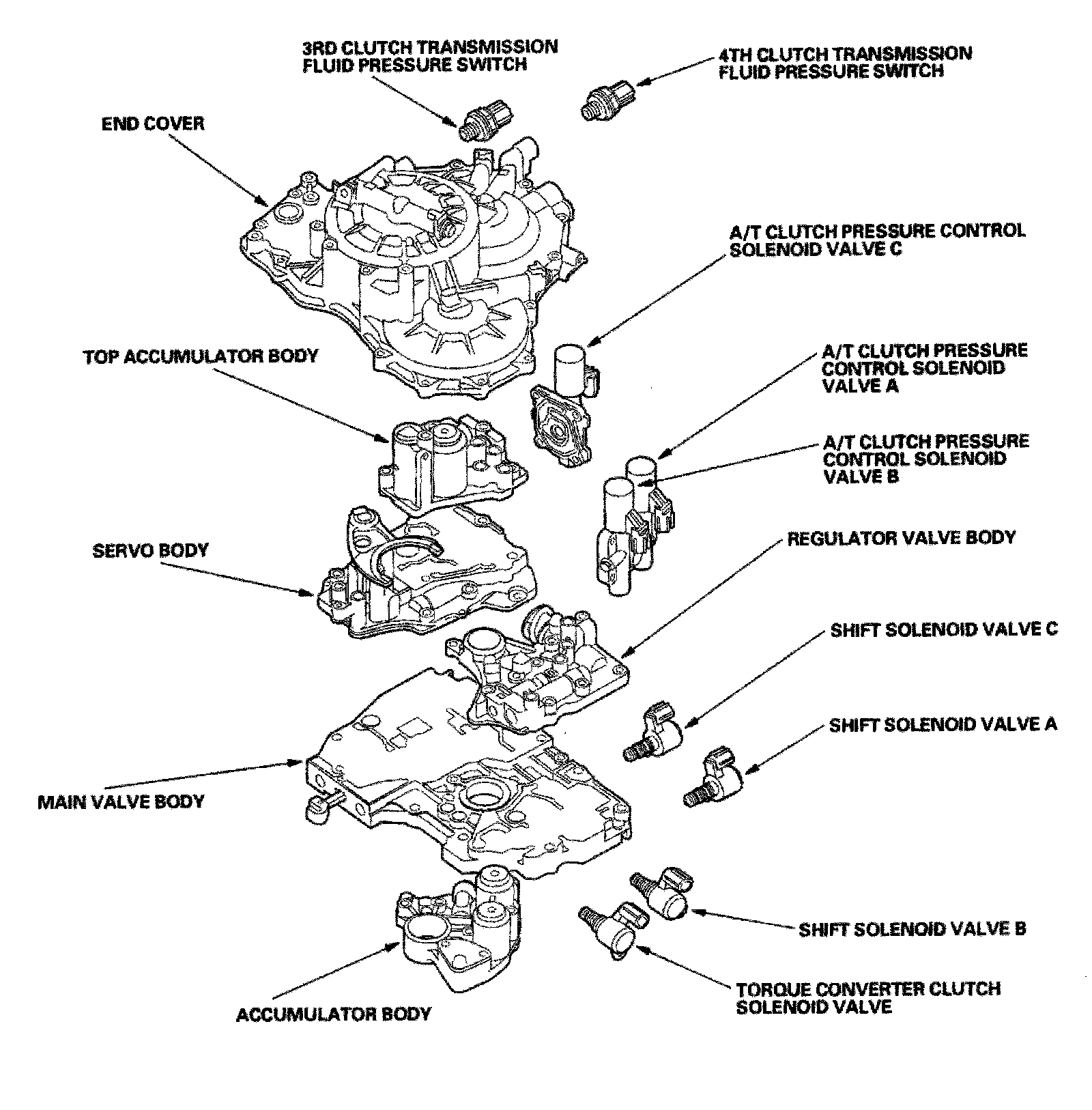 Hydraulic ControlsThe valve body includes the main valve body, the regulator valve body, the servo body, the top accumulator body, and the accumulator body. The ATF pump is driven by splines on the left end of the torque converter which is attached to the engine. Fluid flows through the regulator valve to maintain specified pressure through the main valve body to the manual valve, directing pressure to each of the clutches. The shift solenoid valves A and C are mounted on the outside of the torque converter housing. The shift solenoid valve B and the torque converter clutch solenoid valve are mounted on the torque converter housing. The A/T clutch pressure control solenoid valves A and B, and the A/T clutch pressure control solenoid valve C are mounted on the transmission housing