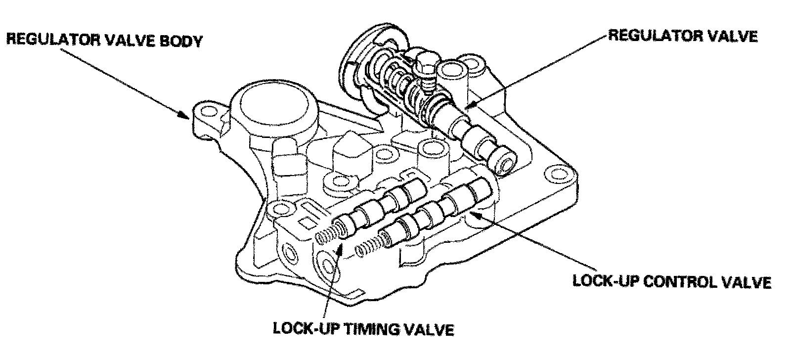 The regulator valve body is located on the main valve body. The regulator valve body contains the regulator valve, the lock-up timing valve, and the lock-up control valve.