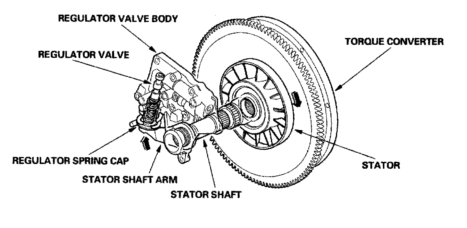 Increases in hydraulic pressure according to torque are performed by the regulator valve using stator torque reaction. The stator shaft is splined to the stator in the torque converter, and its arm end contacts the regulator spring cap. When the vehicle is accelerating or climbing (torque converter range), stator torque reaction acts on the stator shaft, and the stator arm pushes the regulator spring cap in the direction of the arrow in proportion to the reaction. The stator reaction spring compresses, and the regulator valve moves to increase the line pressure which is regulated by the regulator valve. The line pressure reaches its maximum when the stator torque reaction reaches its maximum.