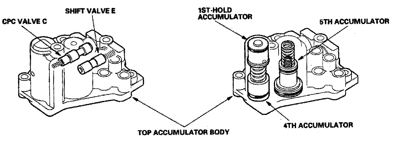 The top accumulator body contains shift valve E, CPC valve C, 4th/1st-hold accumulator, and 5th accumulator.