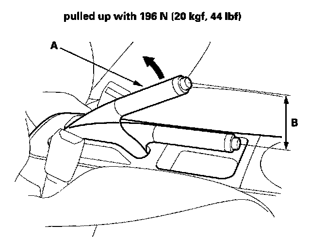 1. Pull the parking brake lever (A) with 196 N (20 kgf, 44 lbs.) of force to fully apply the parking brake. The parking brake lever should be locked within the specified number of clicks (B).