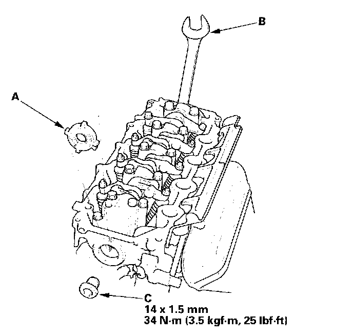 1. Install the TDC pulse plate (A). Hold the camshaft with an open-end wrench (B), then tighten the bolt (C)