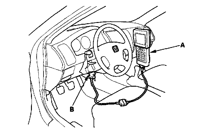 2. If the IMA indicator stays on, turn the ignition switch OFF, then connect the Honda PGM Tester (A) or an OBDII scan tool to the data link connector (DLC) (B) located under the driver's side of the dashboard.