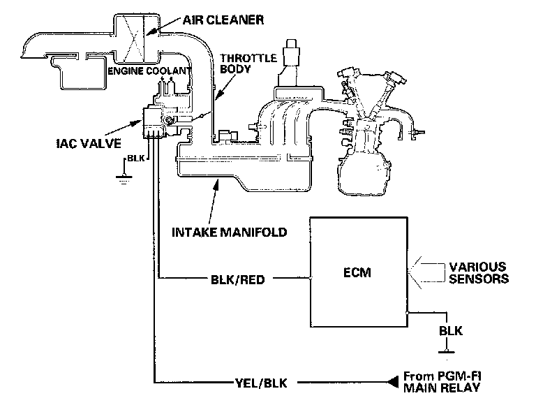 Idle Control SystemWhen the engine is cold, the A/C compressor is on, the transmission is in gear, or the brake pedal is pressed, the ECM controls current to the IAC valve to maintain the correct idle speed. Refer to the System Diagram to see the functional layout of the system.
