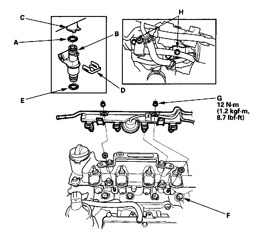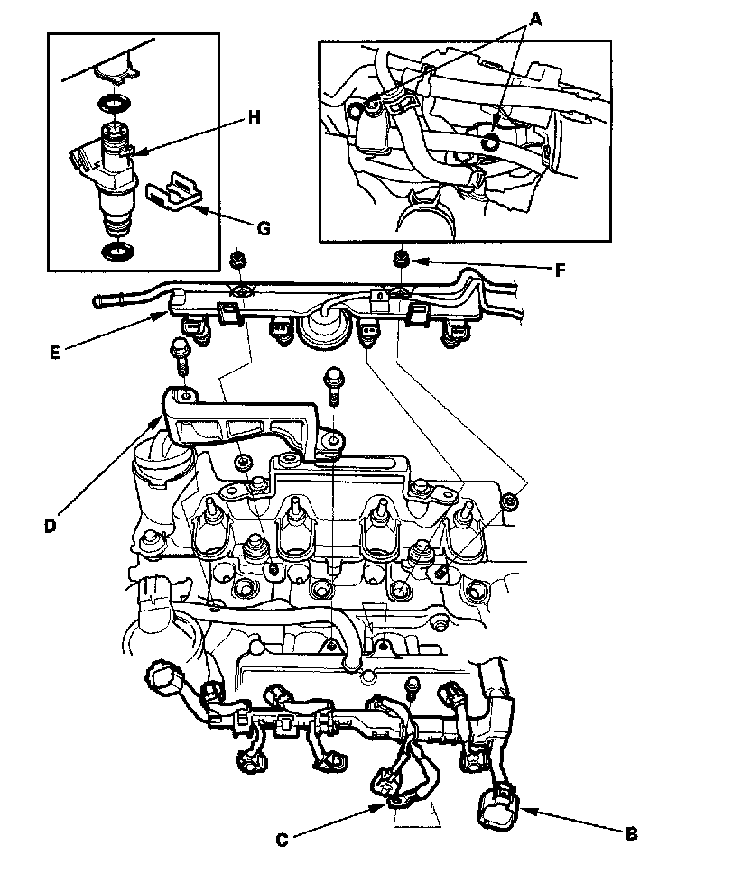9. Remove the fuel rail mounting nuts (F) from the fuel rail, then remove the injectors and fuel rail together.