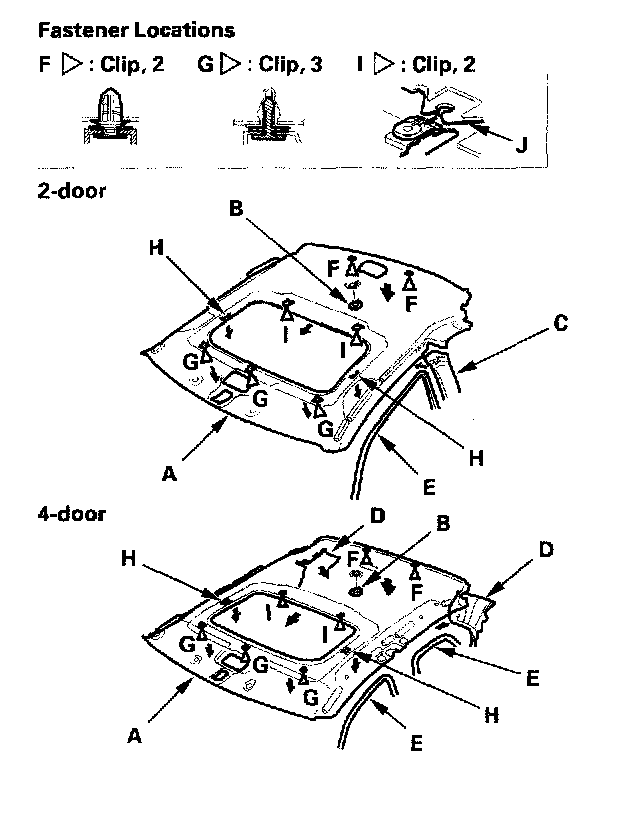 6. Gently pull down the headliner from the moonroof opening, and detach the clips (G) with a clip remover. Gently pull down on the sides of moon roof opening to release fasteners (H). Be careful not to deform the headliner.