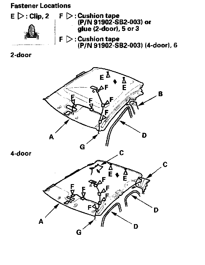6. Remove the cushion tape or glue (F), then remove the roof harness (G) from the headliner.
