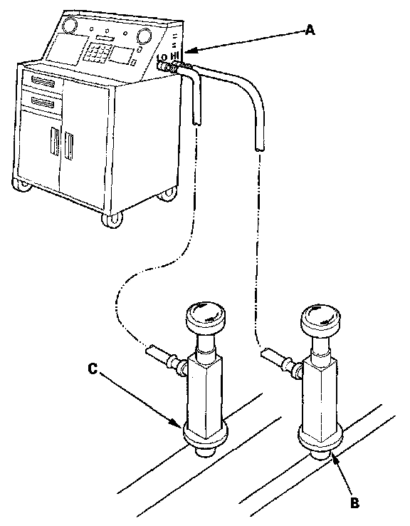 1. Connect a R-134a refrigerant recovery/recycling/charging station (A) to the high-pressure service port (B) and the low-pressure service port (C), as shown, following the equipment manufacturer's instructions.