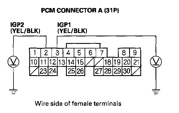 63. Disconnect the 3P connector from each of these sensors, one at a time, and measure voltage between body ground and PCM connector terminal A20 with the ignition switch ON (II).