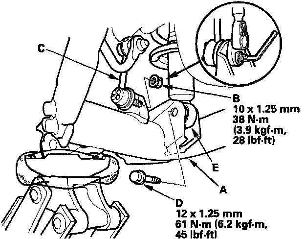 5. Remove the flange bolt (D), and disconnect the damper (E) from the trailing arm.
