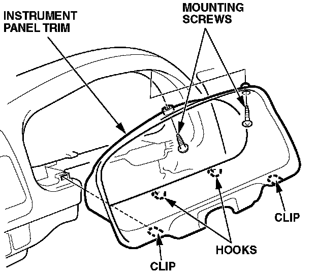 3. Remove the two mounting screws from the instrument panel trim. Gently pull on the bottom of the trim to release the two clips and the two hooks. Carefully pull the trim out of the dashboard.