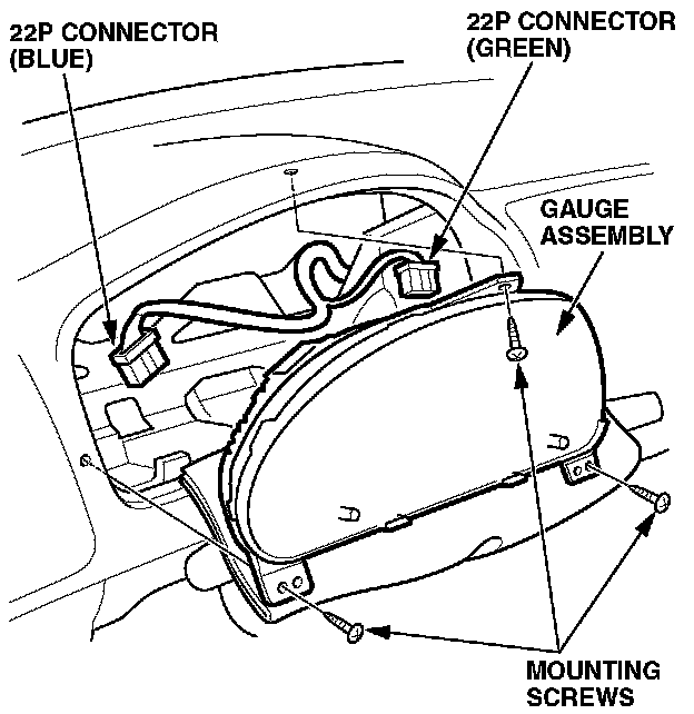 4. Remove the three mounting screws from the gauge assembly, and gently pull it away from the dashboard. Unplug the blue and green 22P connectors from the top of the assembly, then remove the gauge assembly.