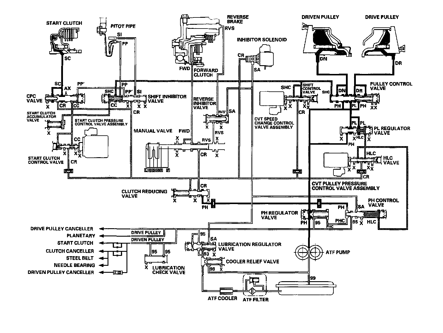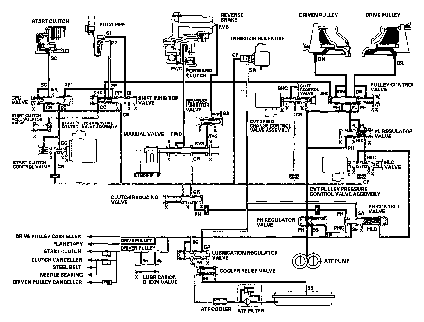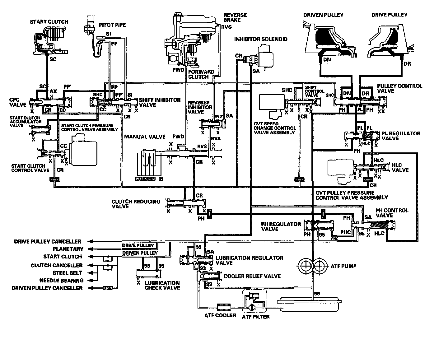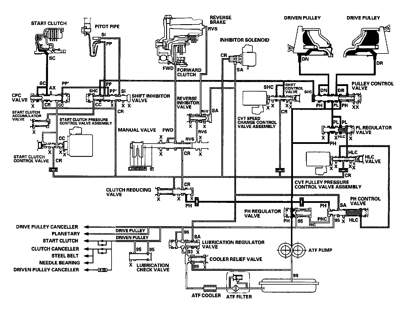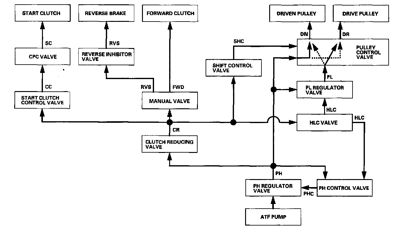 Hydraulic FlowAs the engine turns, the ATF pump starts to operate. Automatic transmission fluid (ATF) is drawn though the ATF strainer and discharged into the hydraulic circuit. Then, ATF flowing from the ATF pump flows the PH regulator valve and becomes the PH pressure. The PH pressure flows to the pulley control valve and then to the pulleys. The PCM actuates the solenoids to control hydraulic pressure shifting pulley ratios and engaging start clutch.