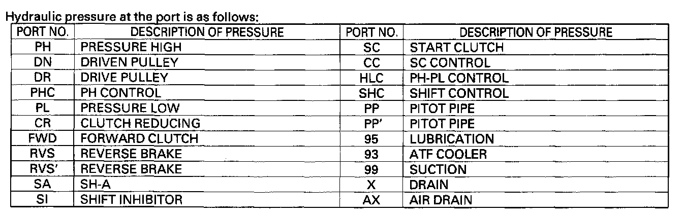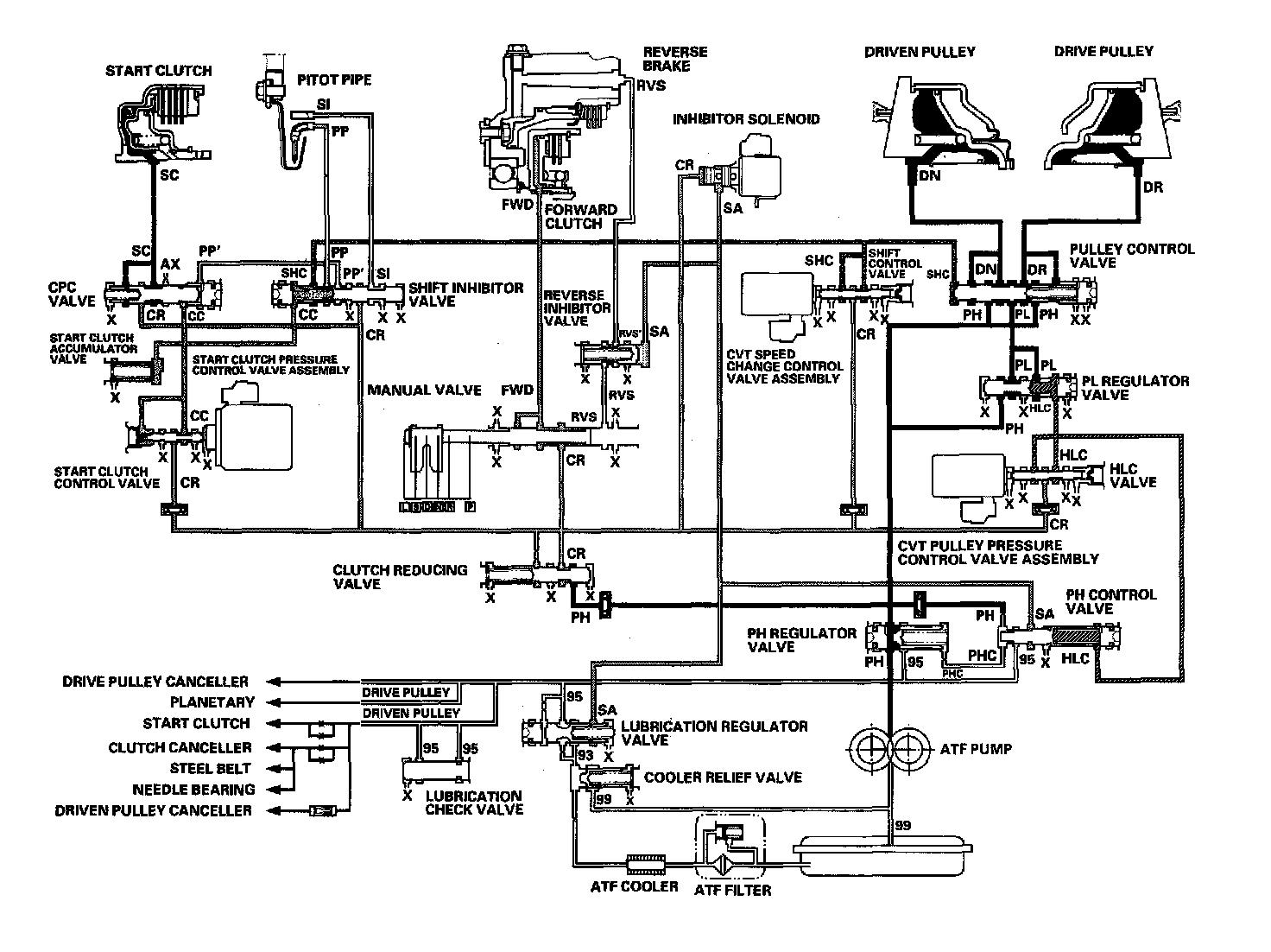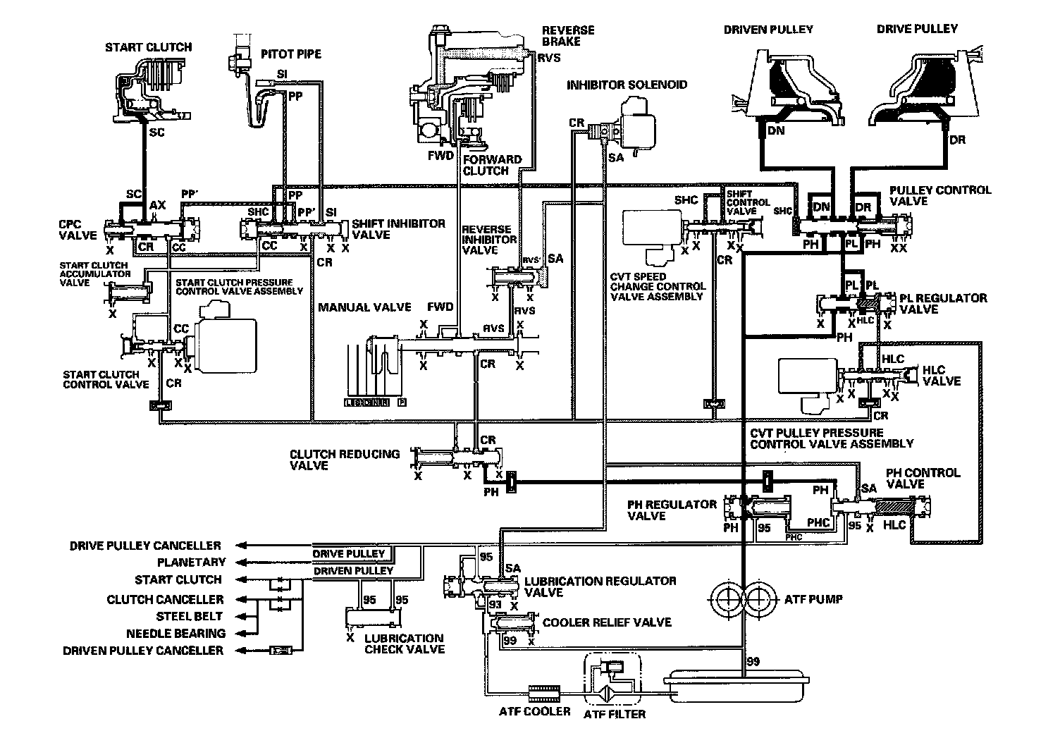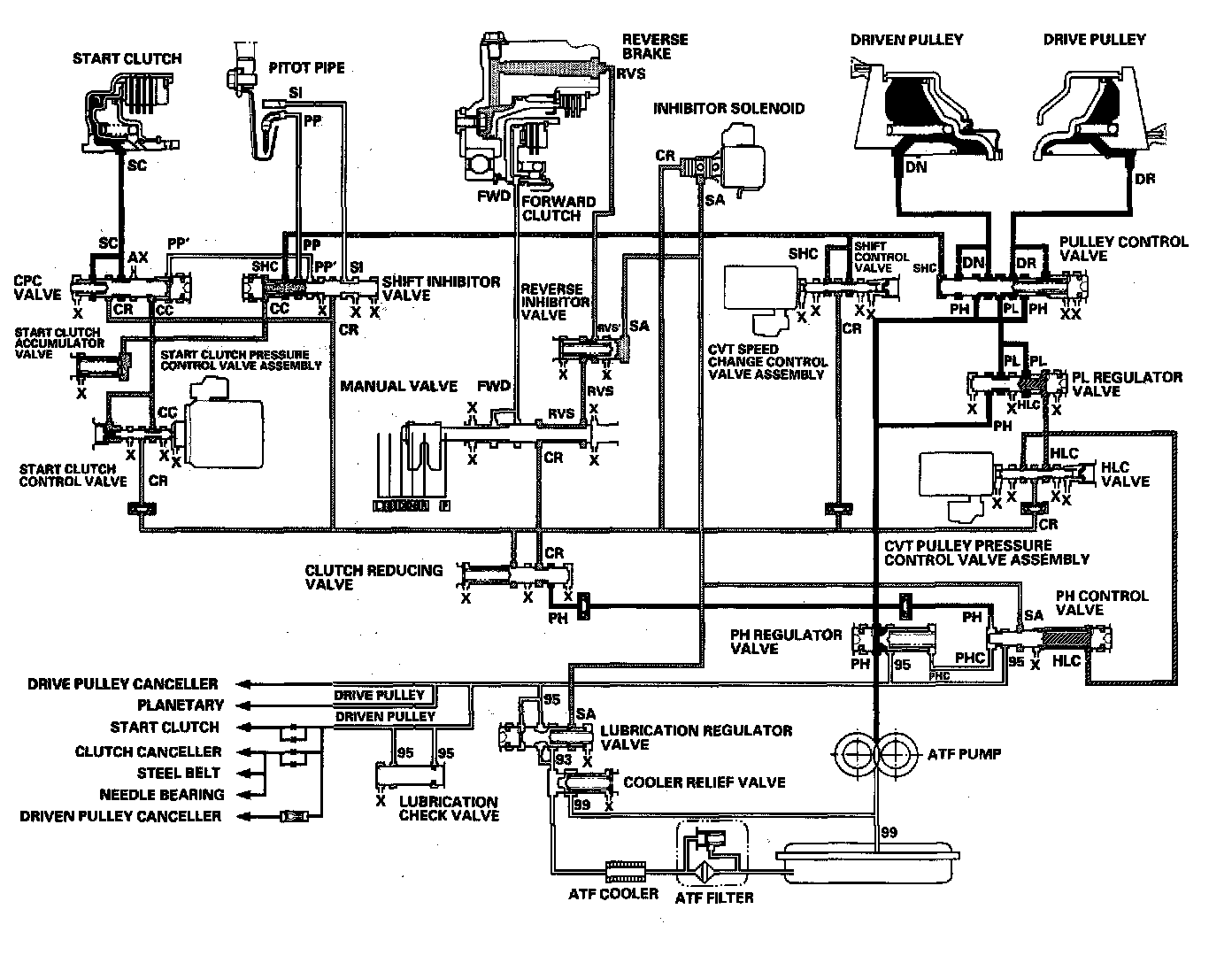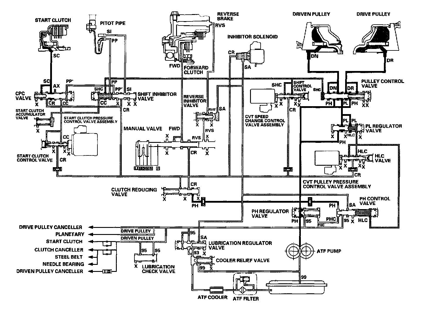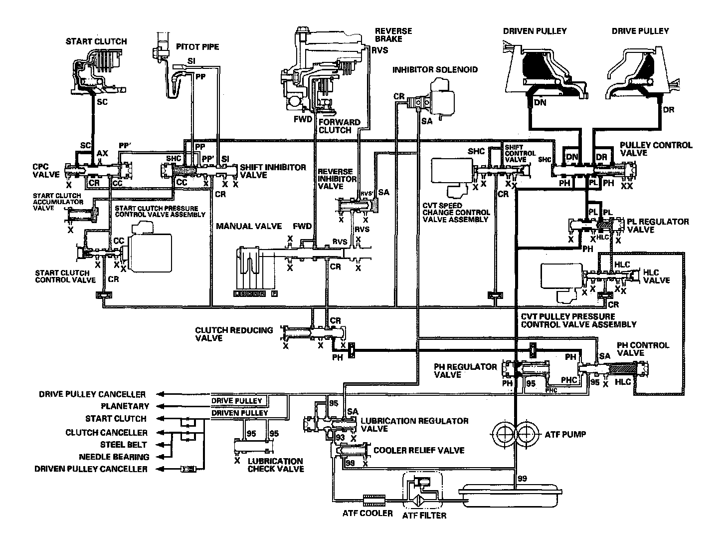 Hydraulic FlowAs the engine turns, the ATF pump starts to operate. Automatic transmission fluid (ATF) is drawn though the ATF strainer and discharged into the hydraulic circuit. Then, ATF flowing from the ATF pump flows the PH regulator valve and becomes the PH pressure. The PH pressure flows to the pulley control valve and then to the pulleys. The PCM actuates the solenoids to control hydraulic pressure shifting pulley ratios and engaging start clutch.