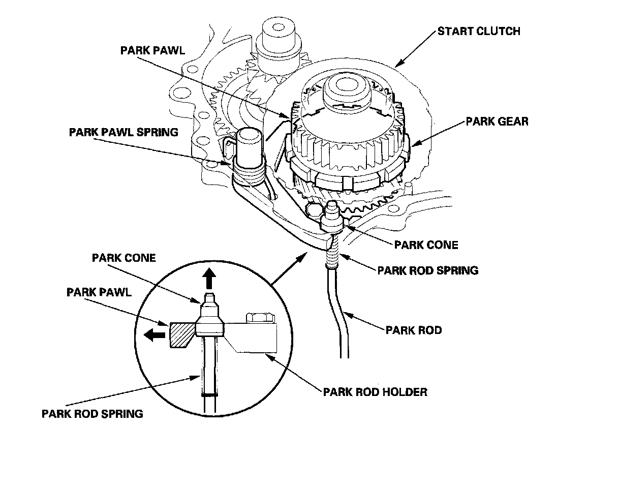 Shifting to the P position causes the park cone (installed at the end of the park rod) to press the park pawl onto the park gear. Even if the end of the park pawl rides on the top of the park gear teeth, slight movement of the vehicle will cause the park pawl and park gear to mesh with each other completely because the park cone receives the tension from the park rod spring. The park pawl receives the tension (which acts to separate the park pawl from the park gear) from the park pawl spring.