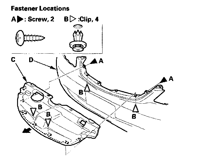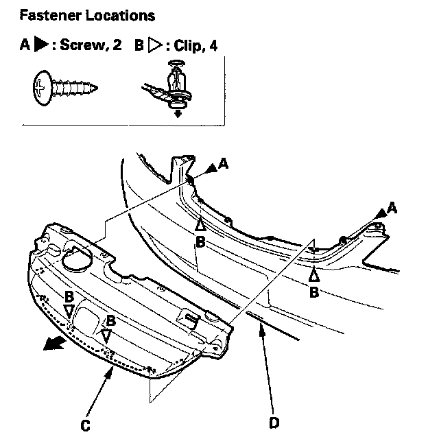 2. Remove the screws (A) and clips (B), and remove the front grille (C) from the front bumper (D) by pulling it out. Take care not to scratch the front bumper.