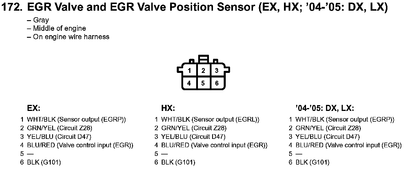 172. EGR Valve And EGR Valve Position Sensor (EX, HX; '04-'05: DX, LX):