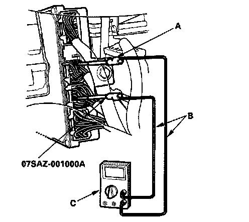 1. Connect the backprobe adapters (A) to the stacking patch cords (B), and connect the cords to a digital multimeter (C).