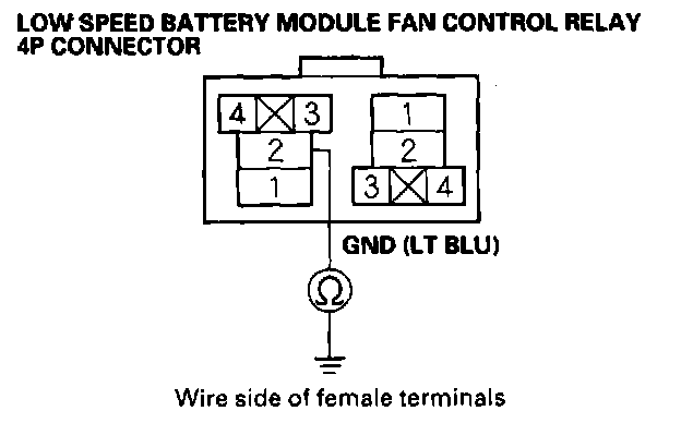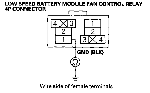 14. Check for continuity between body ground and the low speed battery module fan control relay 4P connector terminal No. 1.