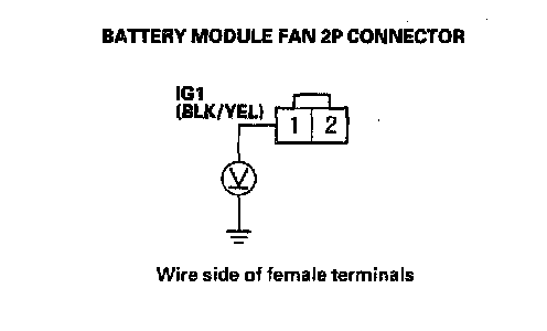 19. Measure voltage between body ground and the battery module fan 2P connector terminal No.1.