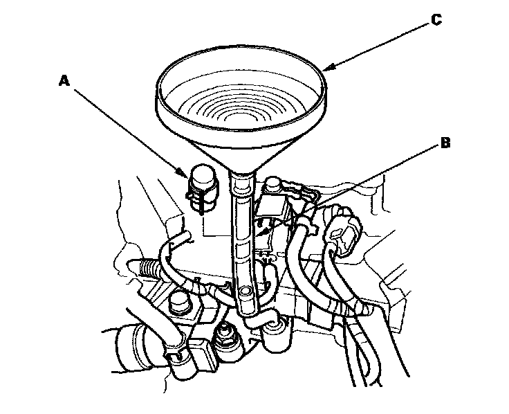 12. Remove the cap (A) from the water outlet, then install an 8 mm hose (B) and a funnel (C).