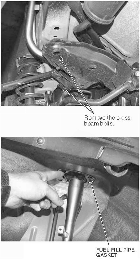 5. Remove the two lower rear cross beam bolts, the two fuel fill pipe bracket bolts, and the fuel fill pipe gasket.