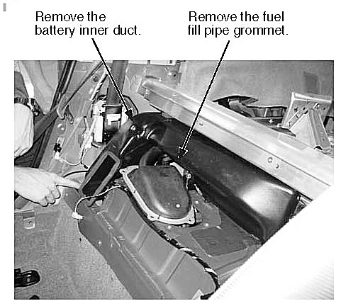 4. Remove the battery inner duct and the fuel fill pipe grommet.