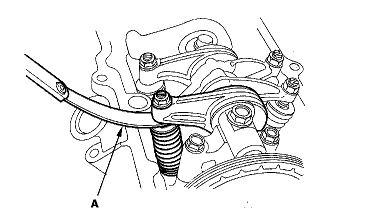 5. Insert the feeler gauge (A) between the adjusting screw and the end of the valve stem and slide it back and forth; you should feel a slight amount of drag.