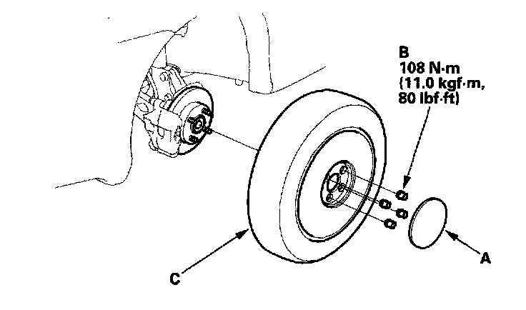 2. Remove the center cap (A), wheel nuts (B), and front wheel (C).