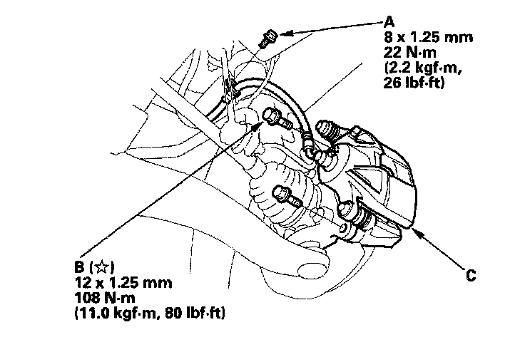 4. Remove the caliper bracket mounting bolts (B), and remove the caliper assembly (C) from the knuckle. To prevent damage to the caliper assembly or brake hose, use a short piece of wire to hang the caliper assembly from the undercarriage. Do not twist the brake hose with force.