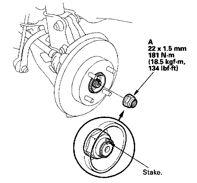 - Before installing the new spindle nut, apply a small amount of engine oil to the seating surface of the nut. After tightening, use a drift to stake the spindle nut shoulder against the driveshaft.