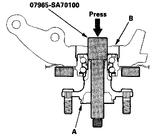 14. Separate the hub (A) from the hub bearing unit (B) using the special tool and a press. Hold onto the hub to keep it from falling when pressed clear.