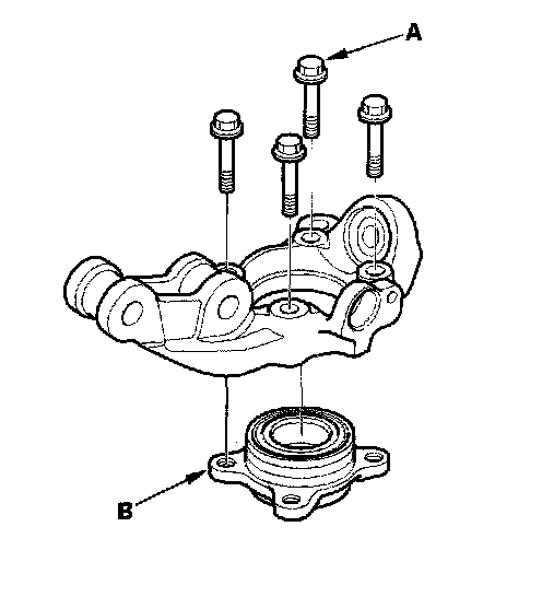 17. Remove the flange bolts (A), and remove the hub bearing unit (B) from the knuckle.