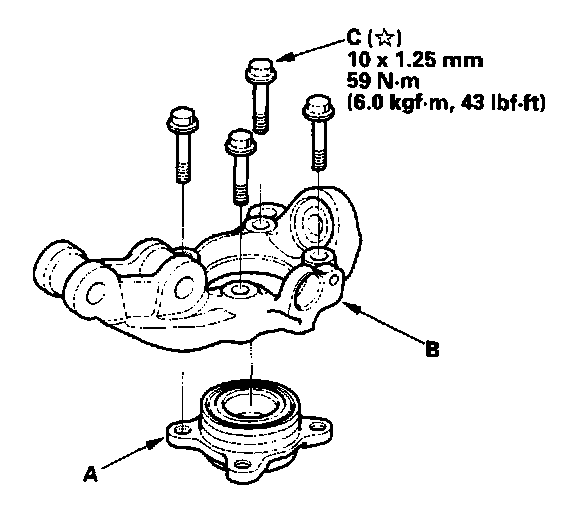 19. Install the hub bearing unit (A) on the knuckle (B), and tighten the flange bolts (C) to the specified torque.