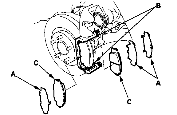 3. Remove the pad shims (A), pad retainers (B), and pads (C).