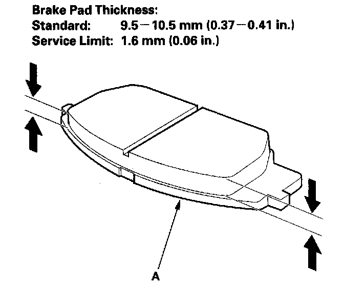 4. Using vernier calipers, measure the thickness of each brake pad lining. The measurement does not include the pad backing plate (A) thickness.