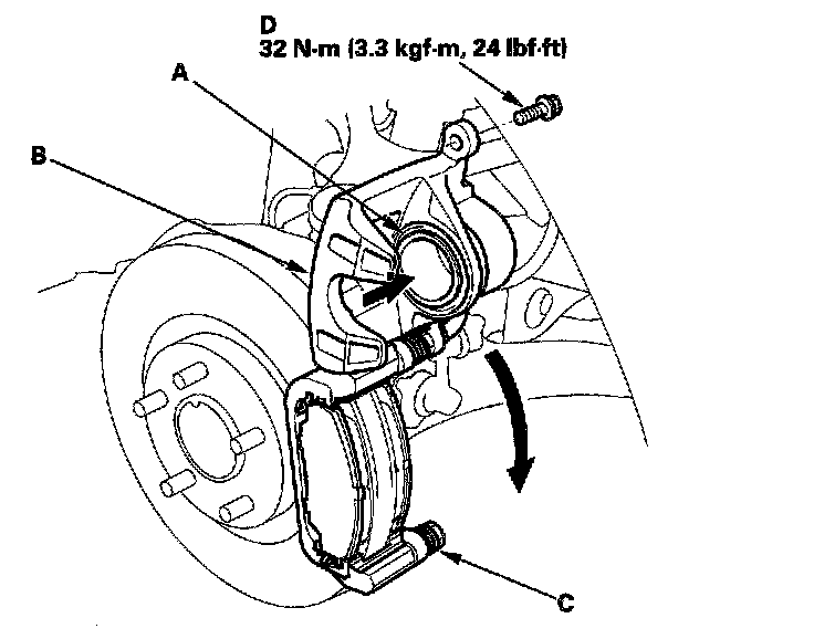 12. Pivot the caliper (B) down into position, being careful not to damage the pin boot. Hold the caliper pin (C) with a wrench, being careful not to damage the pin boot. Install the caliper bolt (D), with another wrench, and torque it to proper specification.