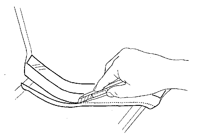4. Carefully trim the headliner with a utility knife, reducing the overlap to less than 12 mm ('04 Model, 2-door) or 15 mm.