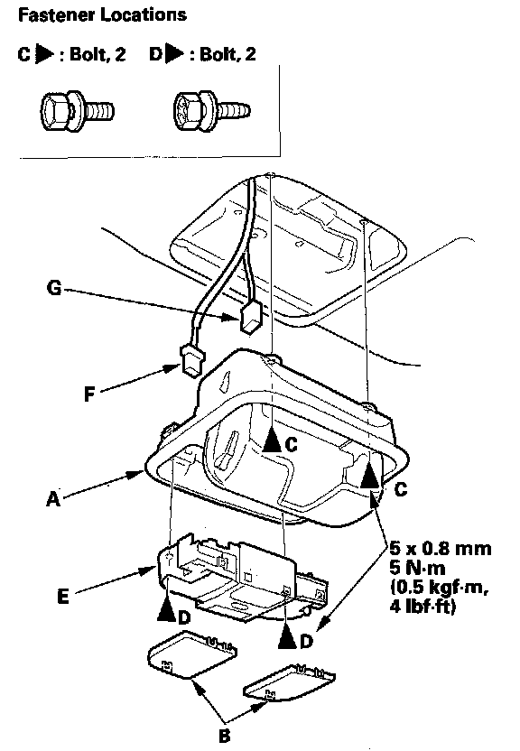 3. Pull out the roof console, and front individual map light (E). Disconnect the front individual map light connector (F), and if equipped, ambient light connector (G).