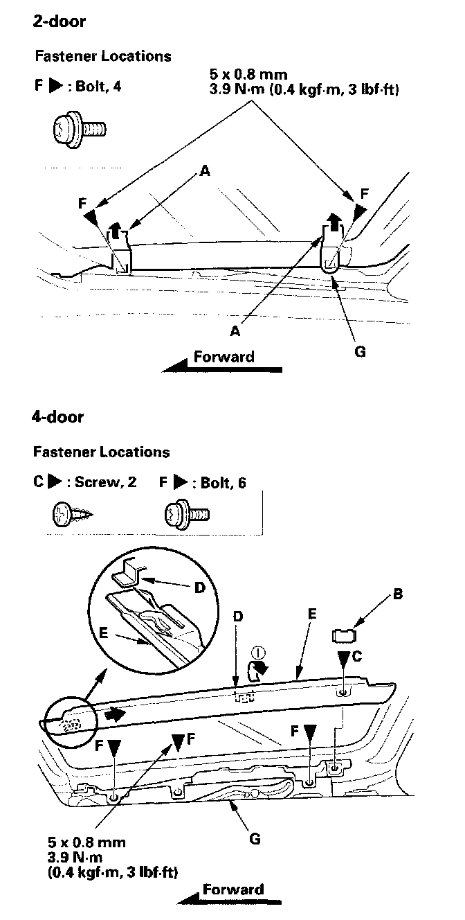 3. 2-door: Turn the slit portions of the molding (A) up. 4-door: Pry out the lid (B), remove the screws (C), and release the hooks (D),then remove both bracket covers (E).