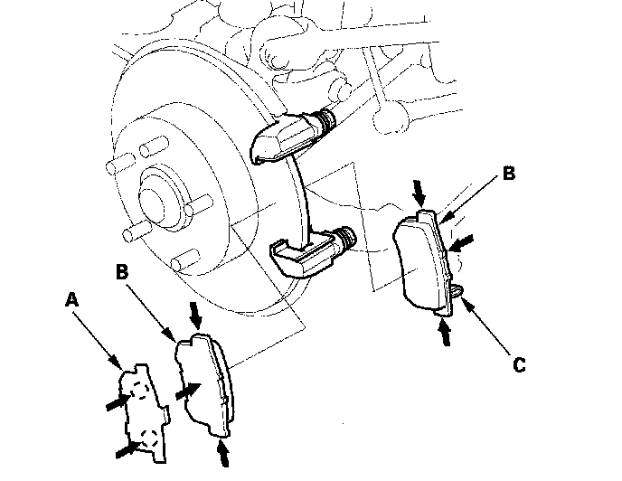 10. Install the brake pads and pad shims correctly. Install the brake pad with the wear indicator (C) on the inside bottom.