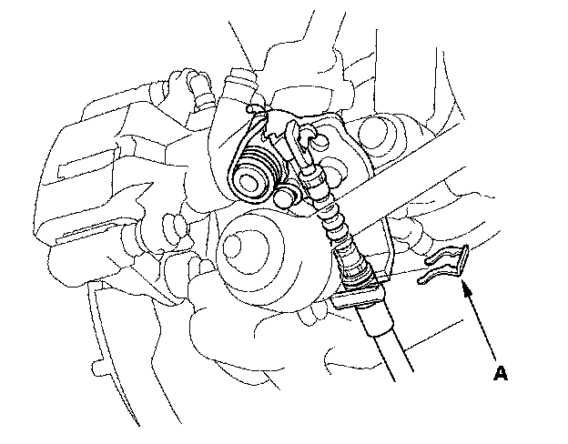 2. Remove the flange bolts (A) and parking brake cable (B) from the backing plate (C).