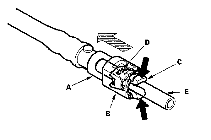 10. Disconnect the quick-connect fitting (A): Hold the connector (B) with one hand, and squeeze the retainer tabs (C) with the other hand to release them from the locking tabs (D). Pull the connector off.