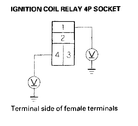 3. Measure the voltage between ignition coil relay 4P socket terminal No.1 and body ground, then terminal No.4 and body ground.