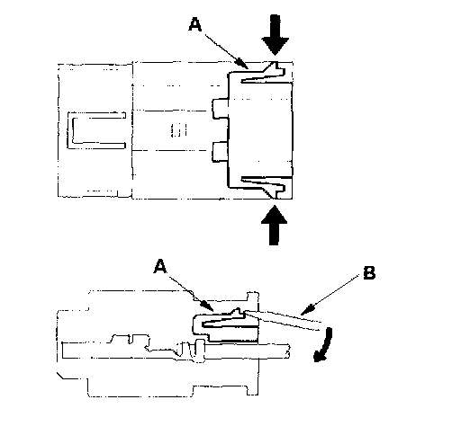 To remove the retainer (A), insert a flat-tip screwdriver (B) between the connector body and the retainer, then carefully pry out the retainer. Take care not to break the connector.