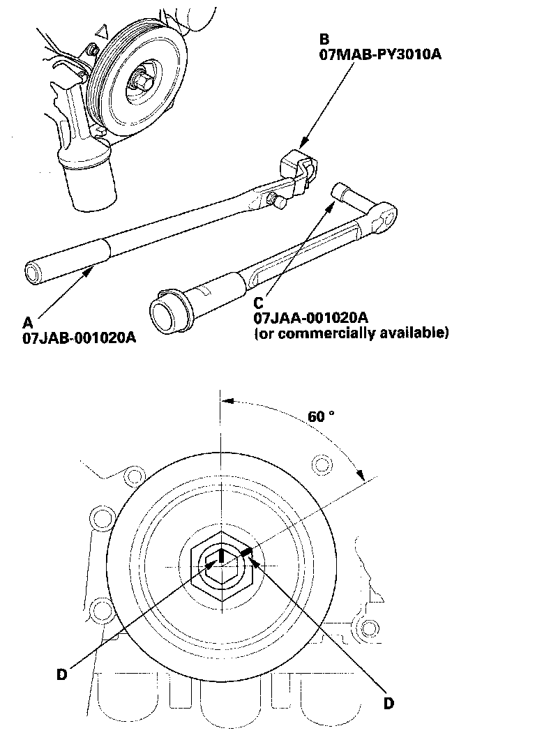 - 2 Mark the bolt head and crankshaft pulley as shown, then tighten the bolt an additional 60° (The mark on the bolt head line up with the mark on the crankshaft pulley).