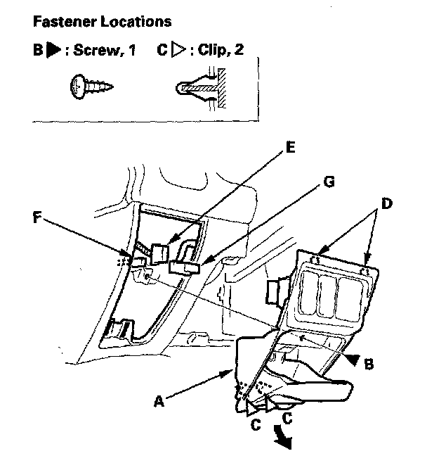 -2 Open the pocket, and remove the screw (B).-3 From behind the dashboard, push the pocket back by hand to release the clips (C).