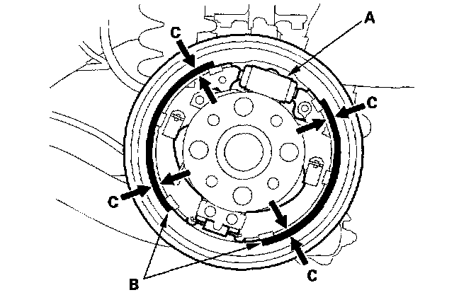 4. Check the brake linings (B) for cracking, glazing, wear, and contamination.